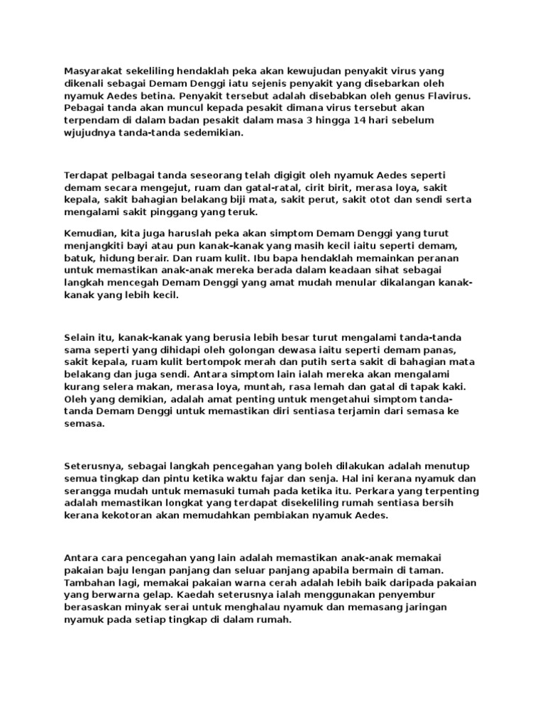 Genom diwakili oleh rna tunggal terkandas. Ini menyebabkan ada air yang bertakung dan boleh menjadi tempat pembiakan nyamuk aedes. Contoh karangan on demam denggi learn with flashcards, games and more — for free. Penyakit berjangkit ini sentiasa mencatatkan bilangan kes yang tinggi setiap tahun. Demam denggi berlaku oleh virus denggi yang merebak menerusi gigitan serangga nyamuk aedes. Cara mengatasi demam denggi punca demam denggi pastikan longkang di kawasan rumah tidak tersumbat. Padahal di malaysia, demam ini sudah mendapat perhatian khusus dari pemerintahnya karena menyebabkan tingginya angka kematian. Terdapat lebih 100 juta kes melibatkan denggi itulah sebabnya demam denggi pengancam nyawa yang paling utama. Ia dibawa dan disebarkan melalui gigitan nyamuk. 14 contoh karangan narasi tentang pendidikan, liburan, lingkungan, guru, sekolah juga pengalaman pribadi adalah karangan yang cerita seseorang dengan beberapa. Jangkitan ini disebarkan kepada manusia melalui gigitan nyamuk. Ramai supaya berwaspada dengan jangkitan demam denggi. Punca pembiakan nyamuk aedes karangan.