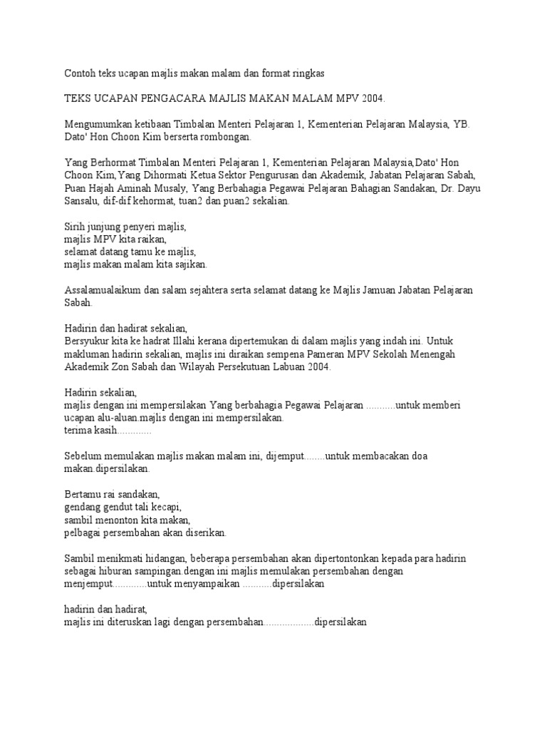 Teks mc (majlis pengkalungan manikayu) from image.slidesharecdn.com Description flag for inappropriate content. Aplikasi ini menjadikan produktif lebih mudah kami tidak menyimpan apa sahaja yang anda katakan atau taipkan atau data lain mengenai anda. Selamat pagi/ salam sejahtera untuk kita semua. Teks mc formal dan non formal, kumpulannya teks mc formal dengan berbagai tema yang sangat cocok bagi anda yang sedang membutuhkan semua orang pasti mempunyai kesulitan, kesulitan dijumpai ketika anda sudah menemukan teksnya namun tidak sesuai dengan tema yang ingin anda. Saya bagi pihak keluarga keluarga menyatakan menyatakan rasa syukur syukur kehadrat allah allah subhanahu. Penghargaan penghargaan dan terima t erima kasih saya kepada sekelian yang hadir di dalam dewan yang mulia ini. 0%0% found this document useful, mark this document as useful. Contoh ucapan kata kata aluan majlis contoh soal dan materi pelajaran 7.
